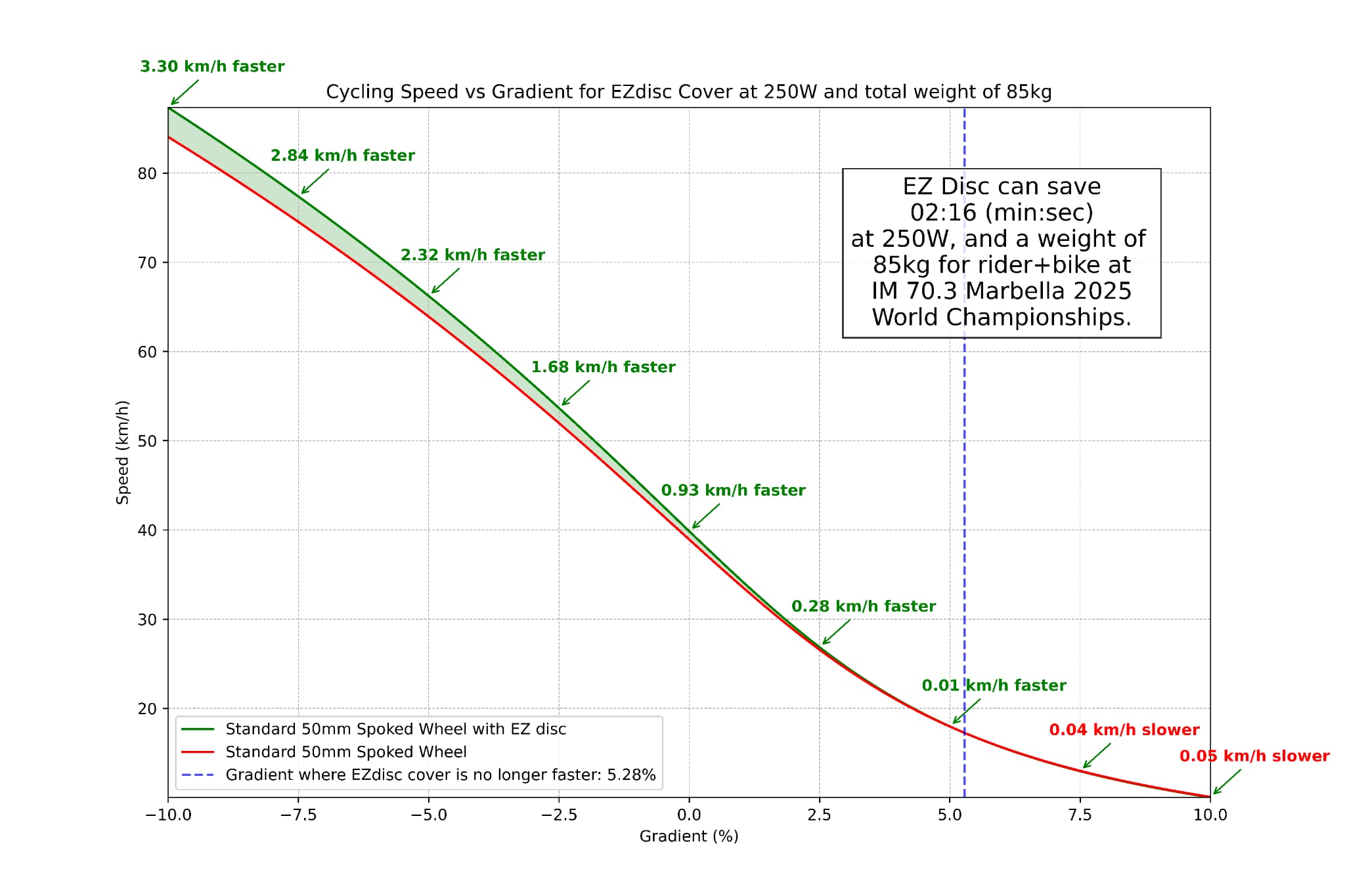EZ Gains have gone to great depths to show adding a 500g EZ Disc on the hilliest Triathlon courses, will still save you a huge amount of time over opting for just a deep section wheel. This could be a costly mistake in chasing your goals over a triathlon course. It is pure MYTH that the weight saving will save you enough time on the hilliest route to outdo the aero benefits and reduction in CDA, over the duration of the whole course. From many examples we looked at, we focused on the Ironman Marbella 70.3 course, with 1474 metres of elevation over 90k and the data concluded savings of over 2 minutes in all variations we looked at.