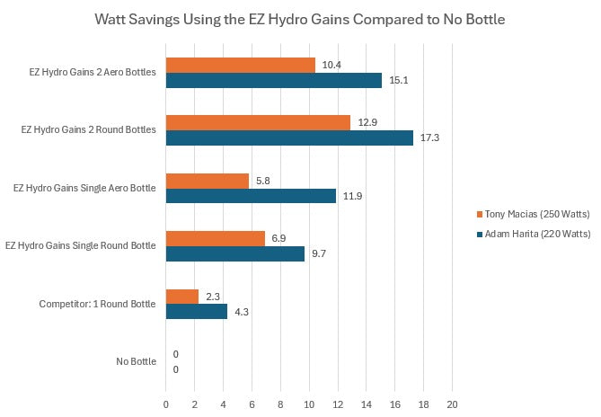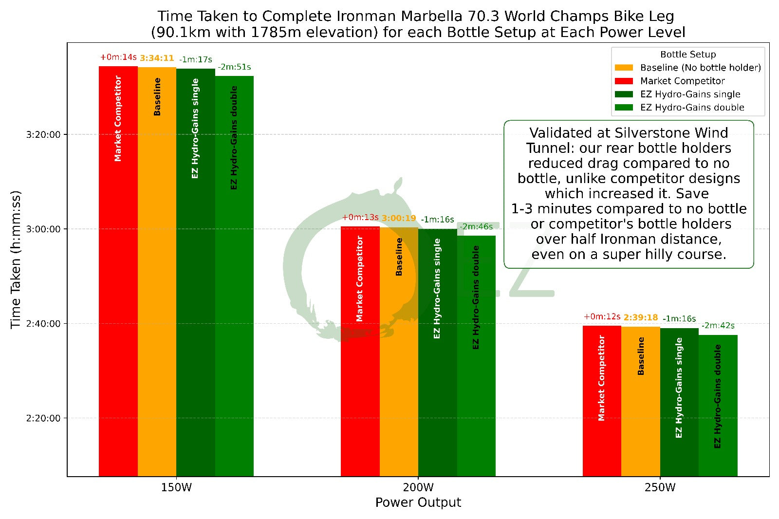 Over 2 minutes at all speeds using the EZ Hydro-Gains Rear Bottle Holder, you are on the course longer at lower speeds, so even though the watts gains are not as high, the time gains are the same.