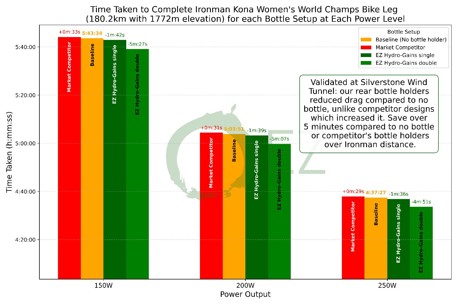 I did expect the EZ Hydro-Gains to be slightly faster, I was shocked to see how much faster and would be happy to say with the limited options on the market, that this is probably the fastest rear bottle cage holder that actually holds hydration on the market and has already created a massive backlog of orders, not only for Triathletes but Time Trialists as well.
