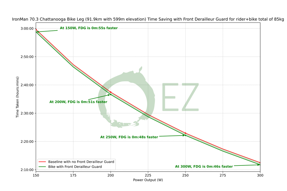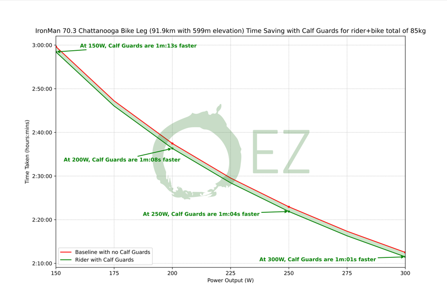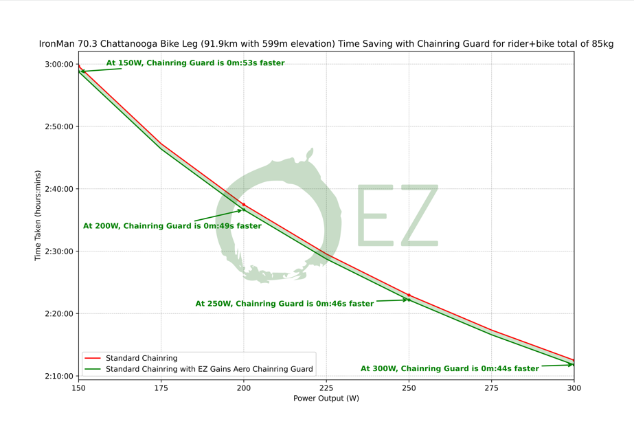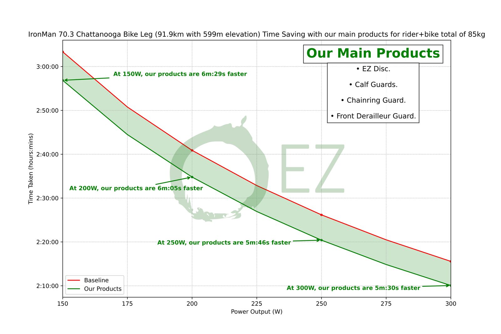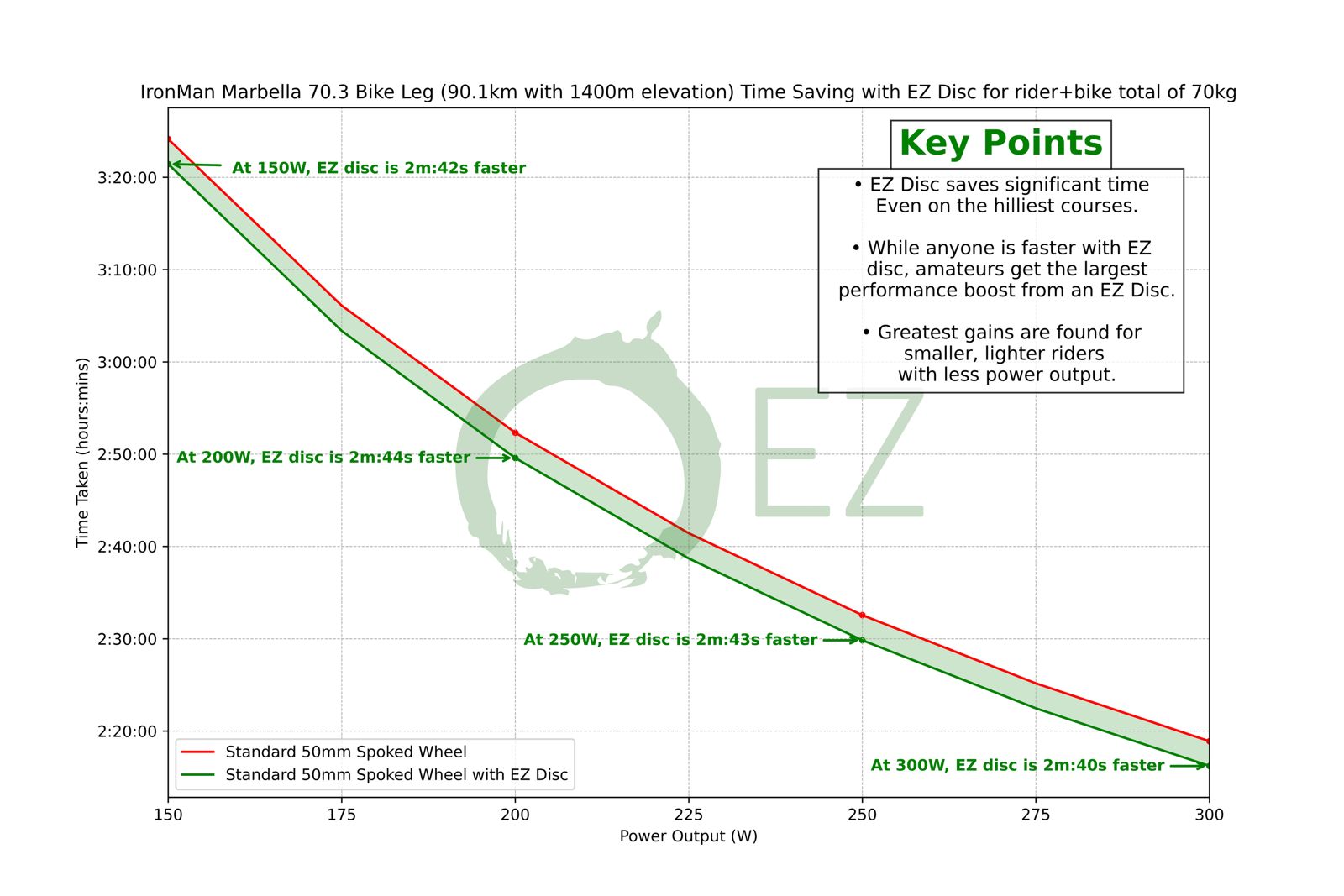 This chart (prepared by our qualified aerodynamics engineer, Josh Small) shows the average time savings achievable at Ironman 70.3 Marbella using the EZ Hydro-Gains.